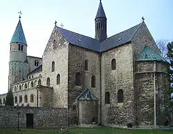 Kościół jest najstarszą zachowaną budowlą z czasów ottońskich. Wpierw zostało wzniesione prezbiterium zamknięte półokrągłą absydą, krypta, oraz trójnawowy korpus nawowy w formie bazylikowej z nawą poprzeczną, ramiona transeptu są zamknięte od wschodu absydami. Zachodni dwuwieżowy westwerk pochodzi z XII w. Na rzucie widoczne są liczne skrzywienia i niedopracowania, prawdopodobnie z błędów budowlanych.