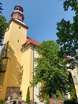 Barokowy kościół wybudowany w latach 1685-1689 na wzgórzu stanowiącym dominantę okolicy[3], według projektu Marcina Urbana z Lubawki. Przebudowany został w 1826.