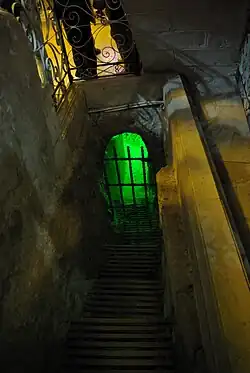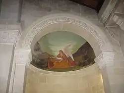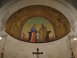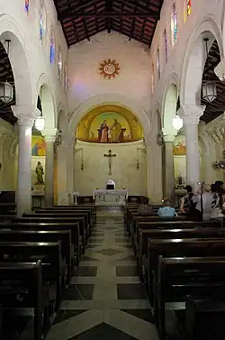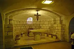 We wnętrzu kościoła znajduje się grota z pozostałościami kościoła krzyżowców. Do krypty prowadzą dwie odrębne klatki schodowe. W podziemiach jest niewielki ołtarz z krucyfiksem, za którym umieszczono dziewięć siedzeń wykonanych z prostego kamienia i drzewa. Sklepienie jest wykonane w formie pół-kopuły, a z tyłu umieszczono niewielkie okno z witrażem przedstawiającym zaślubiny Józefa z Marią[5].