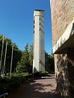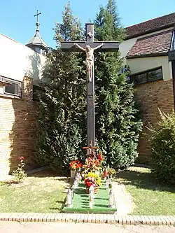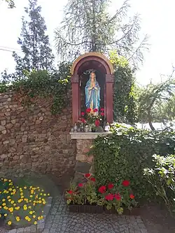 Otoczenie kościoła uzupełnione jest o krzyż misyjny, grotę z figurą Matki Boskiej oraz wolnostojącą dzwonnicę. Dzwonnica wyposażona jest w trzy dzwony, którym nadano imiona: św. Józefa, Maryi oraz Jana Pawła II[2][3].