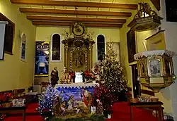 Jest to budowla szachulcowa, trzynawowa, posiadająca konstrukcję słupowo – ramową. Świątynia jest orientowana. Składa się z mniejszego prezbiterium od nawy, zamkniętego prostokątnie, z boku znajduje się zakrystia. Fasada frontowa i wieża są murowane. Wieża na planie kwadratu posiada kruchtę w przyziemiu i zegar. Jest zwieńczona blaszanym dachem hełmowym w kształcie ostrosłupa. Kościół posiada dach dwukalenicowy, nakryty dachówką. Wnętrze nakryte jest stropem płaskim, belkowym. Wewnątrz znajdują się empory, podparte słupami. Do wyposażenia należą ołtarz główny wykonany w XVIII wieku i ambona wykonana w 2 połowie XVII wieku, obydwa w stylu barokowym, a także chrzcielnica kamienna, reprezentująca styl neogotycki wykonana w 1865 roku[2].