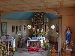 Prezbiterium jest trójbocznie zamknięte ze sklepieniem o łuku obniżonym, z okrągłymi oknami; z boku przylega zakrystia. W nawie o rzucie zbliżonym do kwadratu strop jest płaski – po bokach wieży z zachodniej strony budynku znajdują się dwa składziki. Sama wieża nakryta jest ośmiobocznym, baniastym hełmem; posiada nieznacznie pochylone, szalowane ściany. Dachy nad nawą i prezbiterium siodłowe, kryte gontem – ściany na zewnątrz również są szalowane. Nad nawą umieszczono sześcioboczną wieżyczkę z sygnaturką, nakrytą baniastym hełmem. Główny ołtarz w kościele pochodzi z początku XVIII wieku i został wykonany w stylu późnobarokowym. Oprócz niego najbardziej cenne elementy wyposażenia to późnobarokowe rzeźby z wieku XVIII oraz barokowa ambona z XVII wieku. Chór o prostym parapecie wsparto na 2 kolumnach.