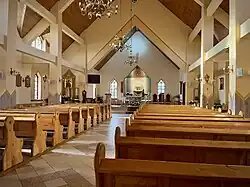 Kościół jest trzynawowy, wzniesiony na rzucie prostokąta, ma nawę środkową znacznie szerszą i wyższą od naw bocznych. Po obu stronach nawy środkowej zbudowano po cztery ryzality, które poszerzają przestrzeń wewnętrzną kościoła, tworząc boczne nawy. Ryzality zakończone są daszkiem dwuspadowym, prostopadle do dachu nawy głównej. Na jej osi, w części północnej, usytuowane jest węższe prezbiterium. Do części wschodniej prezbiterium przylega zakrystia. W części południowej usytuowana jest kruchta z wejściem głównym do kościoła[3].