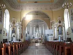 W wystroju wnętrza kościoła należy zwrócić uwagę na ołtarz główny z figurą patronki, wyrzeźbioną przez Alfreda Wiśniewskiego, wykonany w 1947 roku oraz dwa klasycystyczne ołtarze boczne z obrazami: Matki Bożej Częstochowskiej i Przemienienia Pańskiego. Interesujące są także cztery plafony na stropie, przedstawiające św. Maksymiliana, Chrystusa, symboliczną wizję wyboru Jana Pawła II na papieża oraz Maryję Pannę. Plafony te zostały namalowane na początku lat osiemdziesiątych XX wieku.