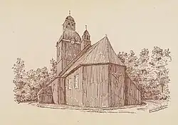 Jest to świątynia wzniesiona w 1780 roku na miejscu poprzedniej, wzmiankowanej w końcu XIV wieku. W 1854 roku od strony zachodniej została dobudowana wieża zwieńczona dachem hełmowym z prześwitem, natomiast pod koniec XIX wieku od strony północnej do nawy została dostawiona murowana kaplica rodziny Lutomskich, od strony południowej jest umieszczona kruchta. Na dwuspadowym dachu pokrytym gontem znajduje się wieżyczka na sygnaturkę. Kościół jest przykładem budownictwa zrębowego, na zewnątrz oszalowanego, wzmocnionego lisicami. Budowla jest orientowana, posiada jednonawowe wnętrze z nieco węższym prezbiterium zamkniętym trójbocznie. We wnętrzu znajduje się późnorenesansowy ołtarz główny ozdobiony krucyfiksem z przełomu XVII i XVIII wieku i barokowymi rzeźbami biskupów i aniołów. Ołtarze boczne reprezentują styl rokokowy, ozdabiają je rzeźby aniołów oraz obrazy: XIX-wieczny św. Jadwigi Śląskiej – patronki parafii i XVIII-wieczny św. Mikołaja. W kaplicy Lutomskich jest umieszczony późnorenesansowy ołtarz wykonany na początku XVII wieku i nagrobna tablica Izydora Lutomskiego, poległego w 1848 roku. Z pozostałych zabytków można wyróżnić: dwie kamienne gotyckie kropielnice i rokokową chrzcielnicę ozdobioną figurą pelikana na gnieździe[2].