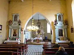 Kościół posiada ołtarz wczesnobarokowy z XVII w., bogato zdobiony ornamentem, kartuszami i herbami. Znajduje się w nim rzeźba Chrystusa Ukrzyżowanego, oraz obraz św. Jadwigi z XVII/XVIII w. W zwieńczeniu ołtarza bocznego znajduje się gotycka rzeźba Matki Boskiej z Dzieciątkiem Jezus, z 2 poł. XIV w.