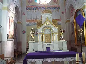 Jest to świątynia orientowana, trójnawowa murowana z cegły. Prezbiterium jest w kształcie prostokąta, kryte sklepieniem kolebkowo-krzyżowym. Od zachodu posiada prostokątną wieżę, zakończoną ośmioboczną kondygnacją ze strzelistym daszkiem. We wnętrzu widać współczesne polichromie stylizowane na bizantyjskie, wykonane w 1978 roku przez macedońskiego malarza Sotyrysa Pantopulosa. Po bokach ołtarza głównego umieszczone są dwie, wykonane na początku XVI wieku, gotyckie rzeźby św. Jakuba Apostoła i św. Katarzyny[4].