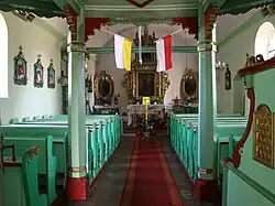 Kościół ma charakter gotycki, jest orientowany, oskarpowany od strony wschodniej i zachodniej. Szczyt prezbiterium uskokowy, ceglany, powstały prawdopodobnie w XVI lub XVII w. W zachodniej części znajduje się wieża nadbudowana w XVII w., zakończona murowaną kopułką i krenelażem. Wnętrze przykryte jest pozornym sklepieniem kolebkowym. Świątynia przeszła przebudowę w XVII w. i restaurację w XIX w. Posiada manierystyczne i barokowe wyposażenie.