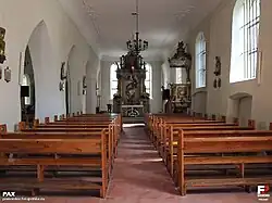 Kościół jest dwunawową niewielką świątynią. Ma 28 metrów długości, 10 metrów szerokości oraz 12 metrów wysokości. Wyposażenie kościoła stanowią ambona i ołtarz z II połowy XVIII wieku. Ołtarz zdobił obraz Chrystusa z 1853 roku, dzieło malarza gdańskiego Louisa Sy; obecnie znajduje się w kurii metropolitalnej. W posadzce zobaczyć można 6 płyt nagrobnych, w tym 4 – z herbami. Wschodni szczyt budowli zdobi rokokowy kartusz z czasów opata Jacka Józefa Rybińskiego (1740–1782).
