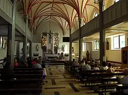 Kościół posiada drewniane sklepienie pozorne, wsparte na 8 drewnianych filarach tworzących emporę biegnącą wzdłuż ścian bocznych, łączącą się nad wejściem głównym. Nad wejściem na emporze znajdują się piętnastogłosowe organy z 1912 roku.