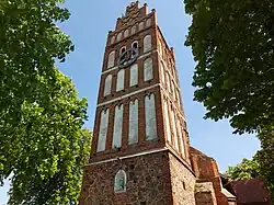 - Zegar na wieży kościelnej z tarczą zegarową na ścianie zachodniej pomiędzy trzecią a czwartą kondygnacją. Do 1948 r. na wieży kościelnej były trzy tarcze. Do czasów współczesnych zachowała się tylko jedna tarcza zegarowa. Pierwotnie koło tarczy było wykonane z drewna, obecnie tarcza jest metalowa. Elementami oryginalnymi dawnej tarczy zegarowej są m.in. miedziane cyfry arabskie. W wieży zachował się w dużej części kompletny mechanizm zegarowy[21].