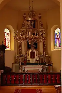 Kościół zbudowany jest na planie prostokąta. Ośmioboczna wieża nad wejściem nieco wystaje przed lico fasady. W kruchcie do czasów obecnych widoczne jest gotyckie sklepienie. W oknach witraże wykonane w 1908 przez Władysława Przybytniewskiego.