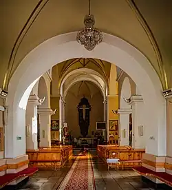 Budynek jest orientowany, bazylikowy, trójnawowy, z transeptem[3]. Wewnątrz zastosowano uproszczone sklepienia klasztorne i sklepienia piastowskie[2]. W wieżę w fasadzie wkomponowany jest kamienny, nietynkowany, pozbawiony ornamentyki portal. Apsyda w prezbiterium od wewnątrz jest zamknięta półkoliście, na zewnątrz trójbocznie. Budynek jest wzmocniony przyporami.