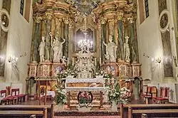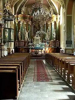 - Ołtarz główny – styl późnego baroku. Ma sześć kolumn i obraz przedstawiający chrzest Jezusa w Jordanie. Figury świętych pomiędzy kolumnami: św. Jerzy, św. Stanisław Biskup, św. Augustyn oraz postać bliżej nieznanego świętego (być może święty Jan Kanty).