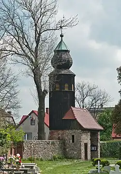 Brama wschodnia z XVIII w. ze stojącą obok drewnianą wieżyczką. Hełm wieży kryty gontem z oryginalną chorągiewką w kształcie wizerunku patrona kościoła[4]. Wieżyczka jest pozostałością po wcześniejszym, drewnianym lub drewniano kamiennym kościele[5].