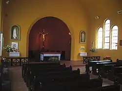 Wnętrze kościoła jest jednoprzestrzenne, z ołtarzem stojącym w apsydzie. Oryginalnie nakryte było murowanym sklepieniem kolebkowym, które podczas odbudowy kościoła zmieniono na drewniane sklepienie eliptyczne. Konstrukcja chóru podparta jest dwoma betonowymi, wyzłoconymi, kolistymi filarami. Pod chórem znajdują się dwa zamknięte pomieszczenia, mieszczące konfesjonały. Wejście do zakrystii znajduje się po lewej stronie ołtarza; prowadzi do niej także osobne wejście zewnętrzne.