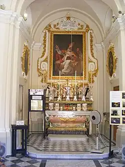 Po obu stronach prezbiterium znajdują się drzwi; te po lewej stronie prowadzą do krypty i katakumb. Nad nimi, w owalnej ramie, portret św. Wincentego a Paulo. Drzwi po prawej stronie, ponad którymi owalny portret św. Joanny de Chantal, założycielki zgromadzenia Sióstr Wizytek, wiodą do zakrystii[5].