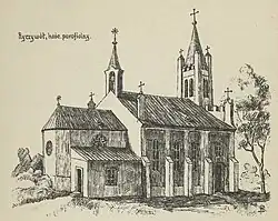 Kamień węgielny pod budowę świątyni został położony w 1875 roku. Murowany z cegły kościół w stylu neogotyckim został zbudowany w latach 1876-1884. Wewnątrz nawa główna jest podwyższona w stosunku do prezbiterium. Na froncie została wybudowana wieża ozdobiona pięcioma wieżyczkami. Świątynia została znacznie zniszczona w 1944 roku. Odbudowa ze zniszczeń wojennych ukończona została dopiero w 1956 roku[2].