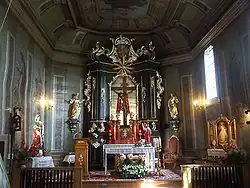 Wewnątrz strop płaski z fasetą. Na ścianach nawy, prezbiterium i stropu polichromia iluzjonistyczna, architektoniczno-figuralna. Na stropie wielopostaciowe sceny: w nawie przedstawienie Trójcy Świętej, w prezbiterium Matka Boska Niepokalanie Poczęta wśród aniołów. Ściany podzielone malowanymi pilastrami o kompozytowych kapitelach wypełniają postaci świętych: w prezbiterium czterej ewangeliści, w nawie po stronie południowej św. Katarzyna, patronka kościoła. Na zachodniej ścianie nad wejściem głównym chór muzyczny wsparty na dwóch wielobocznych filarach z ozdobioną malarską dekoracją (muzykujące aniołki) balustradą.
