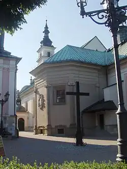 Widok kościoła od strony południowo-zachodniej (z ul. Zamkowej), 2015 | |||||||||||||||||||