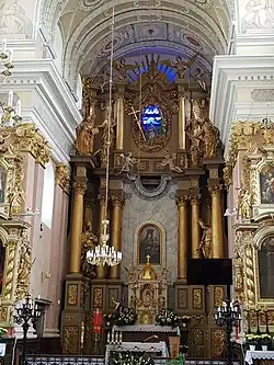 Budowla charakteryzuje się okazałą, ozdobioną bogatym portalem, barokową fasadą. Jej wnętrze nosi cechy stylów: późnego baroku i rokoko, co sprawia, że jest wyjątkowo okazałe. We wnętrzu są XVIII-wieczne, późnobarokowe ołtarze (główny i dwa boczne), a także kolejne dwa ołtarze boczne, ambona i chrzcielnica w stylu rokoko. Rokokowy jest także konfesjonał, pełniący również funkcję ołtarza. Późnorenesansowa płyta nagrobna Krystyny Rzeszowskiej zmarłej w 1622 roku z płaskorzeźbą jej postaci jest kolejnym cennym zabytkiem kościoła, tak samo jak ornaty z XVII wieku[2].