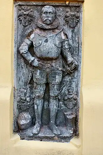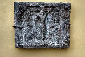 Po stronie zachodniej jest umiejscowiona wieża na rzucie kwadratu. Wejście do niej znajduje się po stronie północnej (klatka schodowa). W przyziemiu elewacji frontowej znajduje się pięć płaskorzeźb, które pochodzą z kapliczek różańcowych. Po stronie północnej dobudowana kaplica, przy prezbiterium, od strony południowej zakrystia (ze sklepieniem krzyżowym).