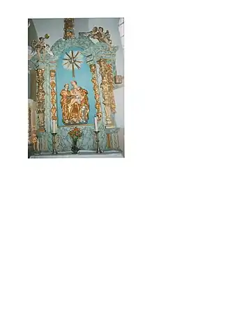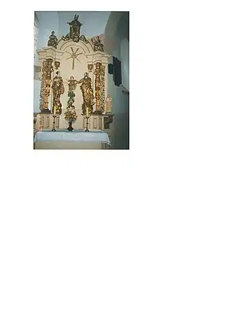 - dwuprzęsłowego i niższego od nawy chóru muzycznego; znajdują się na nim organy mechaniczne z roku 1861. Wybudowała je firma Walter Gebrüder.)