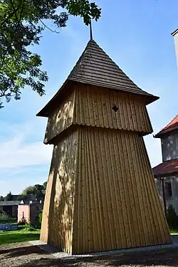 Nawa główna nakryta jest dachem dwuspadowym, a nawy boczne – pulpitowym. Na zachodniej części kościoła jest wieża. Na dachu usytuowana jest ośmioboczna sygnaturka[3].