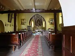 Kościół został wybudowany z kamienia polnego przekładanego warstwami z gruzem ceglanym i granitem łamanym. W górnych partiach i na szczycie został nadbudowany cegłą. Otrzymał kształt budowli jednonawowej, orientowanej względem stron świata, posiadającej węższe, trójbocznie zamknięte prezbiterium od strony wschodniej. Długość świątyni to 24 metry, natomiast szerokość to 10 metrów. Zewnętrzne elewacje jej prezbiterium zostały opięte szkarpami, dwie ukośne umieszczone zostały również w zachodnich narożnikach nawy. Wnętrze prezbiterium zostało nakryte rekonstruowanym sklepieniem gwiaździstym[2].