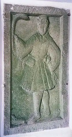Płyta, która pierwotnie znajdowała się na grobie zmarłego w 1599 błazna księcia Jana Fryderyka, została w XIX w. wmurowana w ścianę przedsionka kościoła. Mikołaj Hinze zmarł w wyniku niefortunnego żartu swego pana, który zainscenizował scenę jego egzekucji. Błazen nie wiedział, że podczas "egzekucji" zamiast topora użyta zostanie kiełbasa, a całe wydarzenie jest formą żartu. W wyniku silnych emocji książęcy trefniś zmarł[5].