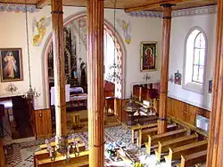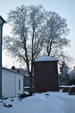 Po zachodniej stronie kościoła znajduje się drewniana, zabytkowa dzwonnica z połowy XIX w., oparta na drewnianej konstrukcji słupowej, pionowo oszalowana. Zbudowana na planie zbliżonym do kwadratu, posiada po dwa prostokątne otwory głosowe z każdej ze stron, przykryte blaszanymi żaluzjami. Zwieńczona dachem z blachy, ze sterczyną z krzyżem. Umieszczone są w niej trzy dzwony[3].
