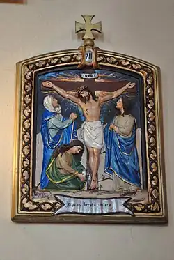 Na prawej ścianie prezbiterium, po dawnej stronie lekcji, została umieszczona tablica poświęcona pamięci budowniczego kościoła parafialnego. Wykonana z brązowego marmuru, mimo jednak zębu czasu (z pewnością ufundowana po śmierci księdza, a więc po 1884 r.), do dzisiaj jest czytelna i dość dobrze zachowana. Na prostokątnej, poziomo zorientowanej płycie o wymiarach 0,61 cm na 0,75 cm wyryto złotymi literami następujący tekst: