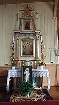 Frontowa elewacja zachodnia jest symetryczna. Zamontowano w niej drewniane dwuskrzydłowe drzwi obite listwami z motywem rombów. Nad drzwiami widoczne są dwa prostokątne okna, powyżej okap. W szczycie zamontowano małe trójkątne okna. Na froncie kościoła w 2018 zawieszono drewniany ludowy krucyfiks z figurą Jezusa. Transept po obu stronach zamknięty trójbocznie z oknem. W aneksach zamontowano po jednym prostokątnym oknie[2][6]. Do aneksów prowadzą oddzielne zewnętrzne i wewnętrzne wejścia z prezbiterium[8]. W prezbiterium trzy okna: dwa większe, jedno mniejsze[6].