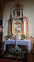 Po obu stronach transeptu znajdują się kaplice z ołtarzami bocznymi. Kaplice są otwarte na nawę główną za pomocą drewnianych arkad. Na chór muzyczny prowadzą drewniane schody. Chór postawiono na podciągu z drewnianej belki, którą osadzono w ścianach i podparto dwoma słupami. Chór jest balkonowy[6]. Prospekt organowy malowany w kwiaty i anioły. Instrument datowany jest na 1906, o czym informuje inskrypcja. Organy wykonano w fabryce instrumentów kościelnych w Warszawie, należącej do Józefa Szymańskiego i jego syna Antoniego[2][9].