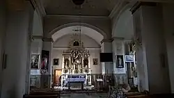 Ołtarz główny świątyni został zmontowany z fragmentów dawnego ikonostasu, z powstałym w 1920 obrazem Serca Jezusa i trzema obrazami na zasuwie. Dwa z nich, postacie Jezusa Cierpiącego i patrona kościoła zostały namalowane w latach 1952-1953 przez Zofię Grabską, trzeci, wizerunek Matki Bożej Niepokalanie Poczętej, być może jest unicką ikoną. Z dwudziestolecia międzywojennego pochodzą ołtarze boczne. Starsze są monstrancja i krucyfiks z XVIII w.[3].
