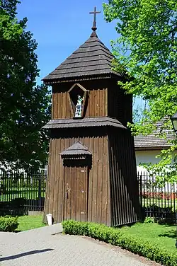 Modrzewiowa budowla ze stromym dwuspadowym dachem krytym gontem, z niewielką wieżyczką zwieńczoną krzyżem, stoi w pobliżu zabytkowego cmentarza z XVI wieku na terenie Grodziska.
