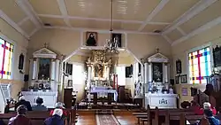 We wnętrzu kościoła znajduje się XVIII-wieczny ołtarz główny z rzeźbami Ewangelistów i obrazem patrona kościoła namalowanym po 1922. Dwa ołtarze boczne również powstały już w dwudziestoleciu międzywojennym, reprezentują styl neoklasycystyczny. Znajdują się w nich obrazy Matki Bożej wzorowany na wizerunku pędzla Correggia oraz świętych Piotra i Pawła. Po 1922 powstała eklektyczna chrzcielnica oraz ambona. Starsze, z początku XX wieku, są krzyż procesyjny oraz żyrandol, natomiast w XVIII wieku powstał zespół rokokowych lichtarzy[1].