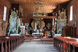 Starsza, wschodnia część świątyni posiada konstrukcję zrębową, nowsza, zachodnia – szkieletową; całość jest oszalowana. Orientowany o jednej nawie; do przedłużonej nawy przylega nieco węższe, trójkątnie zamknięte prezbiterium, z zakrystią od strony północnej. Przy południowej stronie nawy mała kruchta. Dachy pokryte są blachą. Na zachodnim końcu dachu umieszczona jest wieża, zwieńczona blaszanym hełmem z latarnią, na wschodnim skraju kalenicy nawy umieszczona jest wieżyczka na sygnaturkę. Wewnątrz sufit o jednakowej wysokości w nawie i prezbiterium. Na suficie polichromia z 1937 roku.