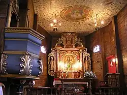 Kaplica boczna pochodzi z 1720, a wieża z 1750 (w obu przypadkach fundatorami byli Lutomscy - właściciele wsi). W ostatnim dziesięcioleciu XX wieku została gruntownie wyremontowana. Kościół orientowany, jednonawowy konstrukcji zrębowej. Na belce tęczowej znajdują się rzeźby Chrystusa i Matki Boskiej Bolesnej oraz św. Jana Chrzciciela.