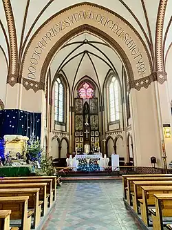 Ołtarz główny kuty jest w mosiądzu z posrebrzanymi reliefami. Po lewej stronie tabernakulum, nad obliczami 6 apostołów umieszczono scenę Zwiastowania, a nad nią Chrztu Jezusa w Jordanie, z prawej nad obliczami pozostałych 6 apostołów umieszczono scenę Przemienienia Pańskiego, a nad nią Ukrzyżowania. Na szczycie ołtarza Duch Święty w postaci Gołębicy z adorującymi figurami aniołów po obu stronach. Tabernakulum jest pozłacane, wykonane z mosiądzu. Na jego drzwiczkach łac. napis: Panis Vitae Vitis Vera, co można przetłumaczyć jako: Prawdziwy Chleb i Winorośl Życia. W centrum ołtarza nad tabernakulum figura patrona kościoła św. Mikołaja. W kościele na ścianach umieszczono figury: na lewej św. Jacka i św. Piotra, a na prawej św. Pawła i św. Anny ze swoją córką Maryją, oraz dwie figury na filarach pod chórem: św. Judy Tadeusza i św. Antoniego trzymającego na swym ręku małego Jezusa oraz dodatkowo od strony nawy głównej św. Ojca Pio i św. Rocha.