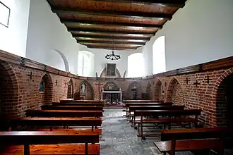 Elewacja ścian i wieża wykonane są z cegły z niewielkim udziałem kamienia narzutowego. Kościół posiada strop prosty, belkowany.