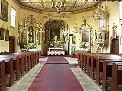 Wyposażenie kościoła jest przeważnie barokowe – ołtarz główny z obrazem świętego Rocha pochodzi z ok. 1700 (choć sam obraz został przemalowany współcześnie). Ołtarze boczne są także barokowe i powstały w II połowie XVII wieku. Cennym elementem wyposażenia jest ambona z początku XVII wieku, zdobiona dekoracją z rzeźbami czterech ewangelistów. Z okresu baroku pochodzą również dwa XVIII-wieczne obrazy św. Barbary i św. Katarzyny.