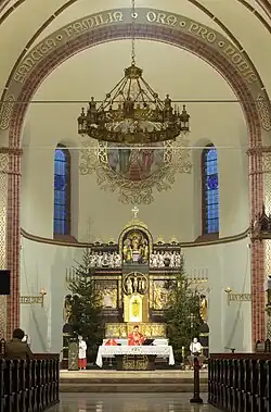 W świątyni zachowało się pierwotne wyposażenie w stylu neoromańskim, pochodzące z początków XX wieku. Ołtarz główny pod wezwaniem Świętej Rodziny, został wykonany przez artystę J. Schneidera i jest zaliczany jest do współczesnych dzieł sztuki. Ołtarze boczne pod wezwaniem Najświętszego Serca Pana Jezusa oraz pod wezwaniem Najświętszej Maryi Panny wykonał F. Masorz z Rybnika. W kościele znajdują się również: ambona wykonana przez artystę J. Rifessera z Grödeln z Tyrolu, prospekt organowy zbudowany przez firmę Riegera, figury św. Anny i św. Antoniego oraz witraż o tematyce figuralnej wykonany przez firmę Mayer z Monachium. Pozostałe witraże są powojenne i pochodzą z lat sześćdziesiątych XX wieku. Ołtarze znajdujące się w nawach bocznych: pod wezwaniem Matki Bożej Fatimskiej oraz pod wezwaniem Krzyża Świętego, jak i pozostałe figury są również powojenne[2].
