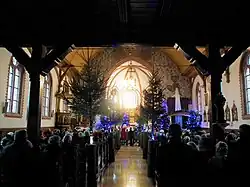 Wystrój i wyposażenie świątyni pochodzi z czasu jego budowy i reprezentuje styl neogotycki. Ołtarz główny, w kształcie tryptyku, posiada płaskorzeźbione sceny Niesienia krzyża i Opłakiwania. W łuku tęczowym znajduje się neogotycka Grupa Ukrzyżowania. Organy zostały zbudowane w królewieckiej firmie Maxa Terletzkiego. W oknach są umieszczone neogotyckie witraże figuralne, wykonane w ratyzbońskiej pracowni Georga Schneidera. Przedstawiają one patronkę świątyni, św. Rozalię (w centralnej części), scenę Zmartwychwstania (z lewej strony) i Wniebowstąpienia (z prawej strony). Trzy kościelne dzwony zostały odlane w 1903 roku w Olsztynie, w filii firmy Franza Schillinga, mającej swą siedzibę w Apoldzie w Turyngii[2].
