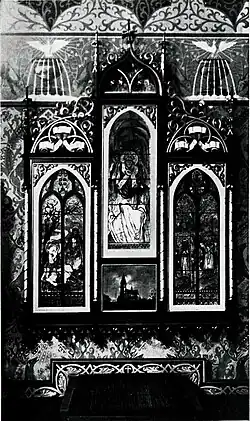 Trzy witraże w absydzie wykonane zostały w Düsseldorfie według kartonów Włodzimierza Tetmajera. Środkowy przedstawia św. Stanisława, powołującego Piotrowina z grobu[5]; prawy świętych Cyryla i Metodego na tle krajobrazu ze starą lipą słowiańską i drewnianą świątynią na wzór kościoła św. Jadwigi w Pszczynie; lewy scenę z Listu do Galatów 2, 14, jak św. Paweł interpeluje św. Piotra. Jerzy Langman na łamach „Głosu Narodu” po śmierci Skowrońskiego napisał: „W tych barwnych szkłach miał być wyrażony wiew z Polski, miał być nakaz do pracy narodowej na tym granicznym odcinku, jakim było prudnickie, miał być tam i nieodparty argument, że droga, którą idzie społeczność Skowrońskiego, jest nie tylko godziwą, ale jedynie mądrą”. Według Emila Szramka, Skowroński w słowach św. Pawła quomodos gentes cogis judaizane? upatrywał „swój program kapłana i patrioty”, a Cyryl i Metody byli „historycznym protestem przeciwko niemczeniu przez Kościół”. Święty Stanisław wskrzeszający Piotrowina symbolizował „wskrzeszenie narodowości w ludzie śląskim”[8].