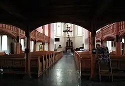 Jest to świątynia zbudowana w latach 1861-1864 w stylu neogotyckim z elementami stylu arkadowego, jednonawowa. Jako kościół katolicki poświęcona w dniu 2 września 1945 r.[2] Została wybudowana z czerwonej cegły na fundamencie z kamienia, posiada dwuspadowy dach. Od strony zachodniej mieści się strzelista wieża, wyposażona w trzy tarcze zegarowe oraz dzwon. Szczyty budowli są zakończone sterczynami. W kruchcie znajduje się chrzcielnica wykonana z cyny. Wnętrze pokryte jest drewnianym, łamanym stropem, podpartym razem z emporami przez dwa rzędy drewnianych słupów. Prezbiterium jest zamknięte pięciokątnie. W nawie i prezbiterium znajduje się 13 półokrągle sklepionych okien, wyposażonych w neogotyckie witraże. Ołtarz główny został wykonany po 1945 r. Wnętrze jest otoczone aż do prezbiterium przez empory: dwie boczne i chórową z organami oraz neogotyckim prospektem. Posadzki są nowe i zostały wykonane z brazylijskiego granitu[3].