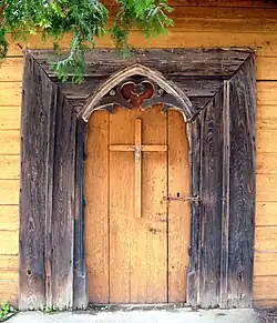 Jedyną pozostałością po tej świątyni jest XVI-wieczny drewniany, ostrołukowy portal wbudowany w drewnianą kaplicę cmentarną z XIX wieku na nekropolii po drugiej stronie drogi. Portal ten ma prostokątne obramowanie z maswerkami, na których wyrzeźbiono stylizowane głowy zwierząt[1].