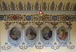 - na ścianach: wizerunki czterech ewangelistów (Marka, Mateusza, Jana, Łukasza) oraz ich atrybuty: lew, anioł[b], orzeł i wół, polichromia ze sceną „Michał Archanioł walczący ze smokiem”, „Spotkanie Chrystusa z Matką Bożą”, „Matka Boża z Dzieciątkiem ukazuje się ludowi polskiemu” oraz „Osiem błogosławieństw”.