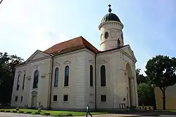 Budynek powstał na rzucie prostokąta (32×22 m); Okrągła dzwonnica na północno-zachodniej fasadzie stoi na podstawie o wymiarach 7 × 12,5 m z potężną łukową arkadą wspartą na dwóch kolumnach, podobnie jak inne budynki kościelne Langhansa. Wieża ma dach w kształcie kopuły z kulą i kielichem na szczycie.