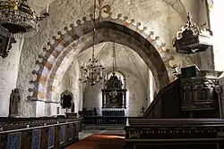 Wnętrze kościoła zdobią średniowieczne freski, odkryte dopiero na początku XXI wieku. Przedstawiają one różne sceny biblijne, w tym mękę Chrystusa. W kościele znajdują się również elementy wyposażenia z czasów średniowiecza: krzyż triumfalny z końca XIII wieku, chrzcielnica również z XIII wieku czy drewniana rzeźba Maryi. Ołtarz jest barokowy, wykonany w 1664 roku. Widnieje w nim przedstawienie Ostatniej Wieczerzy autorstwa Johana Bartscha. Ambona pochodzi z 1722 roku, a w 1744 roku została pomalowana. Epitafium datowane jest na XVII wiek[2][3][4].